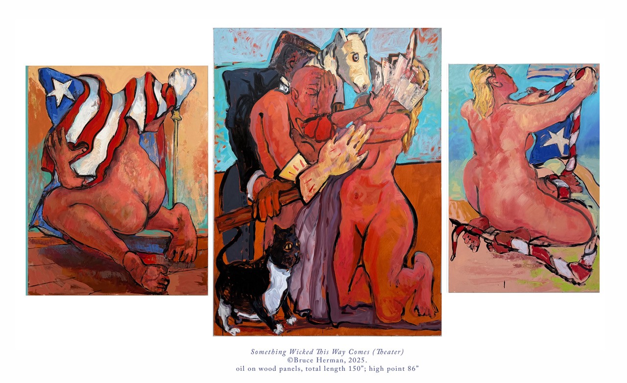 I’ve been a professional artist for more than half a century. When I was twenty-five, I imagined that after I’d been painting for fifty years, I’d have a sense of mastery that would yield critical approval and financial reward. I’ve had both these things and, in fact, been fairly successful–but the name and fame game has always left me cold. It’s shallow and fickle and brings little real satisfaction. I’m motivated to uncover things in the act of painting. Invisible realities—a kind of inner landscape. I believe that behind what’s happening in our country right now is something very ancient and deeply malevolent–but I don’t think it is human in origin. I’m not discounting the very real evil afoot on a human level. But my new paintings are a kind of behind-the-veil danse macabre. A memento mori–meditation on good and evil…a kind of Bertold Brechtian theater of the absurd. I hope the work connects with people who are hurting right now, as well as those who want to think about what’s really happening around and inside us. The paintings came from somewhere deep inside of me and were a surprise to me–a break from what I’ve been doing for years. They’re a kind of return to where I started in the 1970s. A familiar place that has become unfamiliar. Just like America.