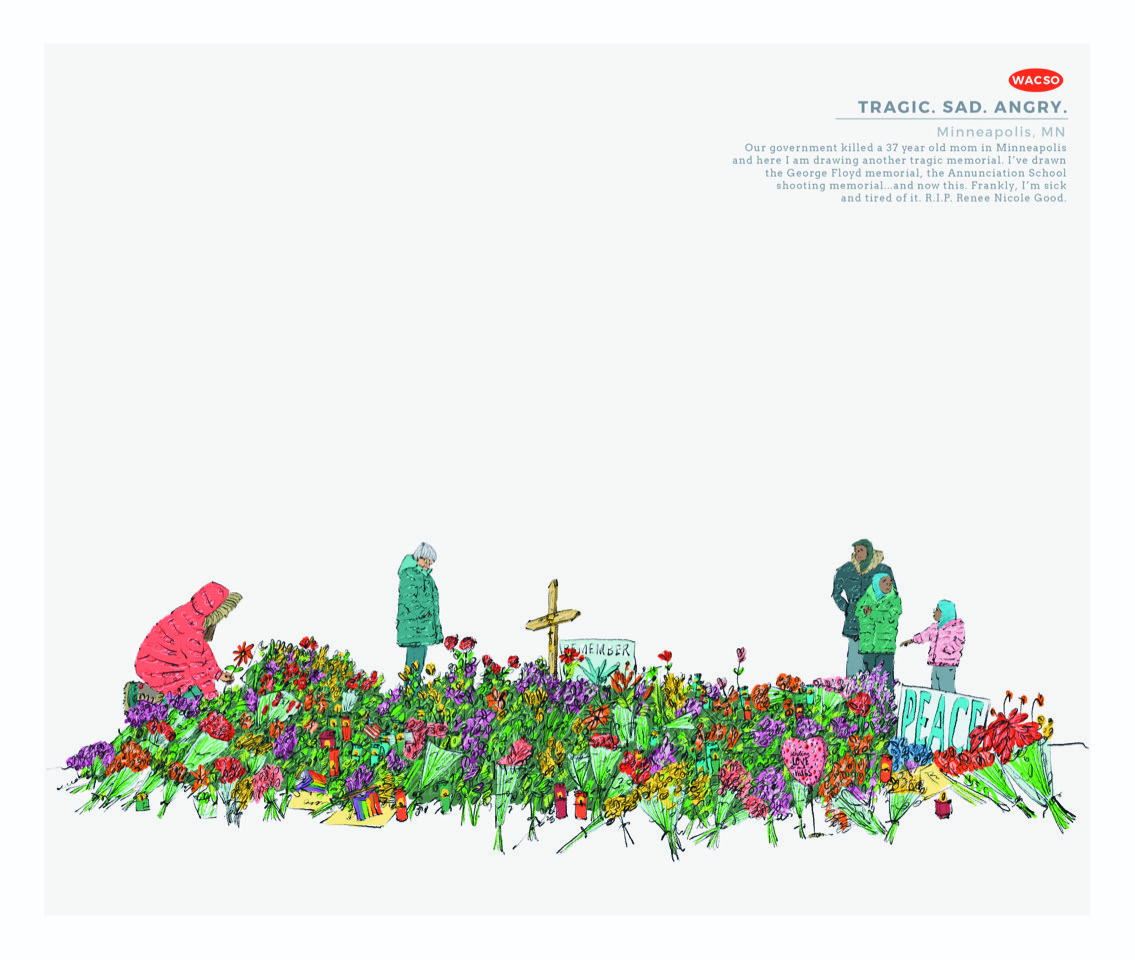 I grew up in Minneapolis, then left in the 80s for the wilds of New York City, but Minneapolis was always home. I was asked by Terry Esau to contribute a work of art to his site highlighting recent heartbreaking events there. VivaLaResistance.org The street where Alex Pretti was murdered was an important street to me and just about everybody I knew. Perhaps it can be a turning point. The world has certainly reacted. Which gives one hope. Billy Barber